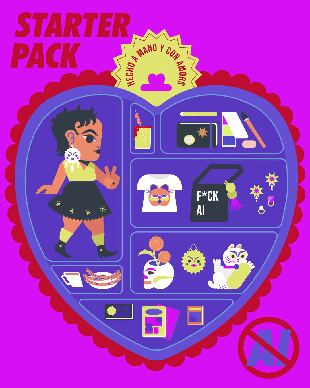 The first image was part of the “Starter Pack” trend, which came as a response to a previous trend in which AI -AI-generated images were used to represent artists as dolls with accessories that define their personality. Artists from all around the world protested against AI by taking this trend and making handmade art to make their doll-package portraits.