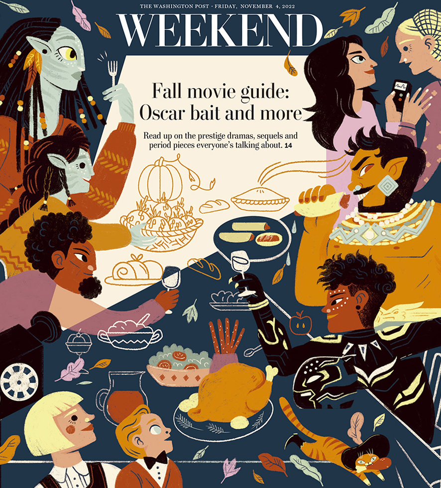 Illustration depicting upcoming movies for the Fall Season, including titles such as Black Panther: Wakanda Forever, Women Talking, Puss in Boots: The last wish, and Avatar: The way of water.